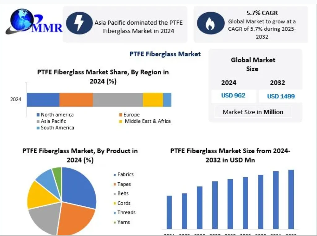 PTFE Fiberglass Market was valued at USD 962 Mn in 2024, and total global PTFE Fiberglass Market revenue is expected to grow at a CAGR of 5.7% with fueled by industrial expansion and eco-friendly innovations and reaching nearly USD 1499 Mn from 2025-2032