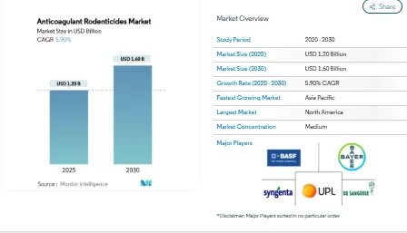 The Anticoagulant Rodenticides Market is witnessing steady demand due to the rising need for effective rodent control across agriculture, storage facilities, and urban environments. According to Mordor Intelligence, the Anticoagulant Rodenticides Market Size was valued at USD 1.20 billion in 2025 and is projected to reach USD 1.60 billion by 2030, growing at a CAGR of 5.9% during the Anticoagulant Rodenticides Market Forecast period.