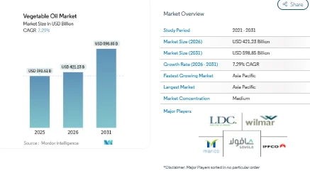 The Vegetable Oil Market continues to expand steadily as demand rises across household cooking, processed foods, and foodservice applications. According to the latest analysis, the Vegetable Oil Market Size was valued at USD 392.61 billion in 2025, reaching USD 421.23 billion in 2026, and is projected to grow to USD 598.85 billion by 2031, supported by a CAGR of 7.29% during the forecast period. This strong Vegetable Oil Market Growth reflects changing food habits, increased consumption of packaged foods, and the global shift toward plant-based diets.