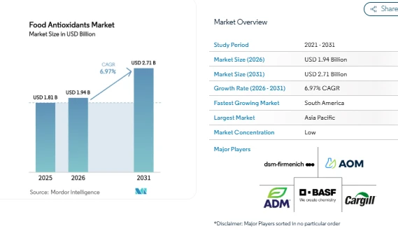 The Food Antioxidants Market is witnessing steady expansion as food manufacturers continue to focus on preserving product quality while meeting changing consumer expectations. According to industry analysis, the Food Antioxidants Market Size is estimated at USD 1.94 billion in 2026 and is projected to reach USD 2.71 billion by 2031, growing at a CAGR of 6.97% during the forecast period. This growth reflects rising demand for longer shelf life, better food stability, and increasing awareness about the effects of oxidation in food products.