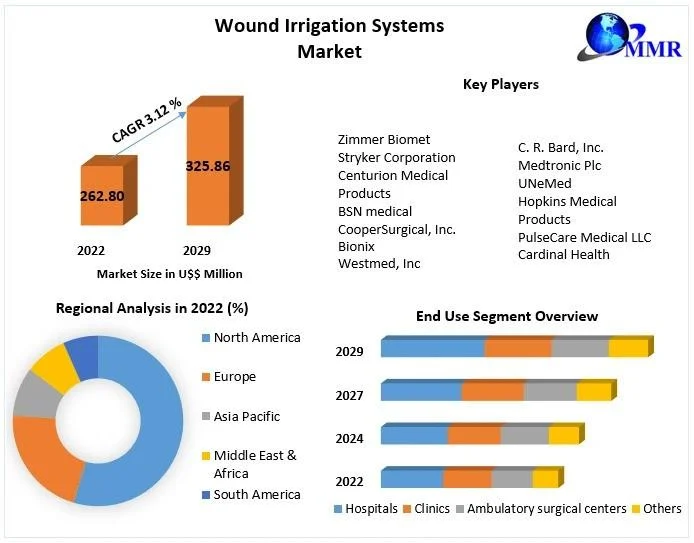 The global Wound Irrigation Systems Market Analysis is projected to reach a valuation of $325.86 million by the end of 2029, exhibiting a compound annual growth rate (CAGR) of 3.12% during the forecast period. Wound irrigation involves the delivery of solutions to open wounds to achieve hydration and remove debris from deeper tissues. Commonly used solutions include water, normal saline, and hydrogen peroxide, which aid in the hydration and cleansing of wounds. This process is essential for effective wound management, particularly in patients with conditions such as diabetes and obesity, where proper wound care is critical to prevent complications.