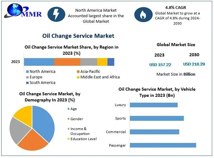 The global Oil Change Service Market Analysis , valued at $157.22 billion in 2023, is anticipated to reach approximately $218.29 billion by 2030, exhibiting a compound annual growth rate (CAGR) of 4.8% during the forecast period. This market encompasses services dedicated to the replacement of engine oil and oil filters in vehicles, ensuring optimal engine performance and longevity. Regular oil changes are essential for maintaining engine health, reducing wear and tear, and enhancing fuel efficiency.