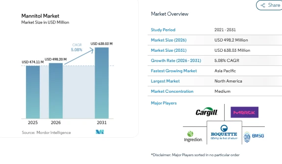 The Mannitol market continues to show steady progress, supported by its wide usage across pharmaceutical and food applications. According to Mordor Intelligence, the Mannitol market size was valued at USD 474.11 million in 2025 and is estimated to grow to USD 498.2 million in 2026, reaching USD 638.03 million by 2031, at a CAGR of 5.08% during the forecast period. This Mannitol market forecast reflects consistent demand driven by changing dietary habits and increasing reliance on functional ingredients.