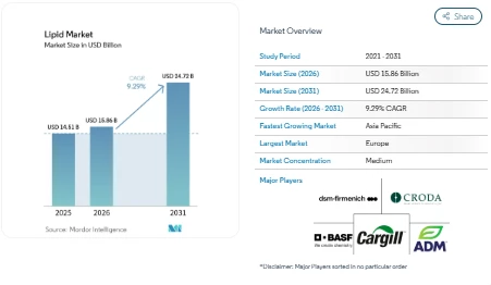 The Lipid market is gaining steady attention as demand rises across food, healthcare, and nutrition sectors. According to Mordor Intelligence, the Lipid market size is expected to grow from USD 15.86 billion in 2026 to USD 24.72 billion by 2031, at a CAGR of 9.29%. This growth reflects changing dietary habits and a stronger focus on preventive health.