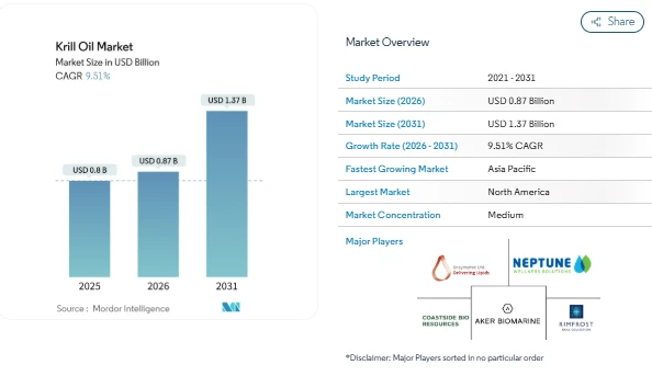 The Krill Oil market is witnessing steady expansion as consumers increasingly focus on preventive health and better nutrition. According to Mordor Intelligence, the Krill Oil market size is expected to grow from USD 0.80 billion in 2025 to USD 0.87 billion in 2026 and reach USD 1.37 billion by 2031, registering a CAGR of 9.51% during the forecast period. This growth reflects rising awareness of omega-3 benefits, improved product formulations, and growing acceptance of krill oil as a premium alternative to traditional fish oil.