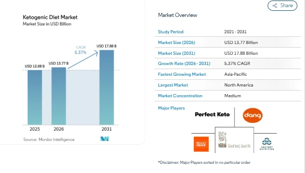 The Ketogenic diet market continues to gain attention as consumers increasingly focus on structured eating habits that support weight management and metabolic health. According to industry analysis, the Ketogenic diet market size was valued at USD 13.08 billion in 2025 and reached USD 13.77 billion in 2026. It is projected to grow to USD 17.88 billion by 2031, registering a CAGR of 5.37% during the forecast period. This steady Ketogenic diet market growth reflects rising awareness around low-carbohydrate diets and their role in managing lifestyle-related conditions.