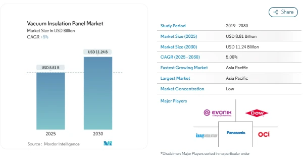 The Vacuum insulation panel market is gaining steady attention as industries shift toward energy-efficient materials and space-saving insulation solutions. According to industry analysis, the Vacuum insulation panel market size is estimated at USD 8.81 billion in 2025 and is expected to reach USD 11.24 billion by 2030, growing at a CAGR of greater than 5% during the forecast period. This Vacuum insulation panel market forecast reflects increasing demand from construction, refrigeration, and logistics sectors.