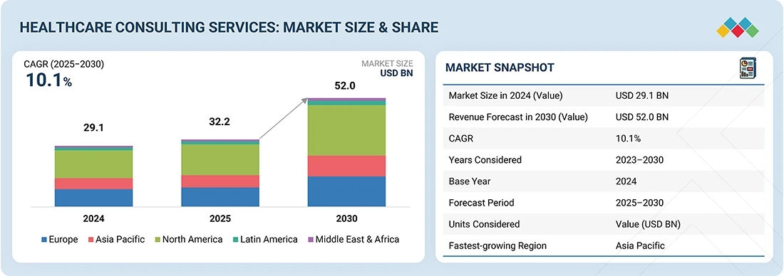 The global Healthcare Consulting Services Market is projected to grow from USD 32.17 billion in 2025 to USD 51.95 billion by 2030, registering a robust CAGR of 10.1% during the forecast period. The market’s strong expansion is fueled by rapid digitization across healthcare systems, increasing adoption of advanced technologies such as artificial intelligence (AI), big data analytics, Internet of Things (IoT), and cloud computing, along with supportive government regulations promoting health IT integration.