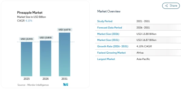 The Pineapple market continues to show steady expansion driven by rising global consumption, stronger trade flows, and increasing preference for fresh tropical fruits. According to market analysis, the pineapple market size is expected to move from USD 13.24 billion in 2025 to USD 13.80 billion in 2026 and further reach USD 16.87 billion by 2031, supported by a stable CAGR of 4.10% during 2026–2031. This reflects consistent demand across both developed and emerging economies.