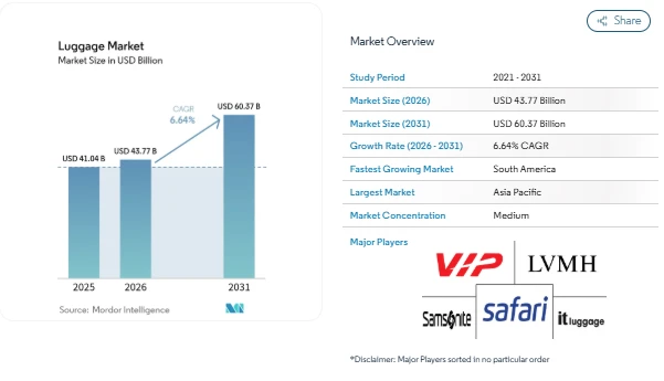 The global Luggage Market continues to expand as travel activity strengthens across international and domestic routes. The market is shaped by rising tourism demand, increased business mobility, and changing consumer preferences toward functional and stylish travel gear. According to industry analysis, the Luggage market size was valued at USD 41.04 billion in 2025. It is projected to grow to USD 43.77 billion in 2026 and further reach USD 60.37 billion by 2031, reflecting steady expansion supported by a consistent Luggage market growth outlook over the forecast period.