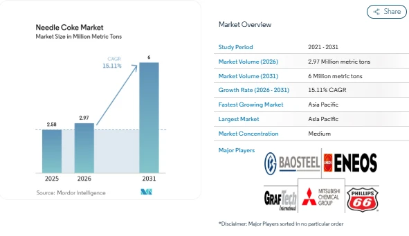 The Needle coke market is witnessing strong momentum as demand rises from both the steel and energy storage sectors. According to Mordor Intelligence, the Needle coke market size is expected to grow from 2.58 million metric tons in 2025 to 2.97 million metric tons in 2026, and further reach 6 million metric tons by 2031, registering a CAGR of 15.11% during the forecast period. This steady expansion reflects the increasing importance of needle coke in high-performance applications such as graphite electrodes and lithium-ion battery anodes.