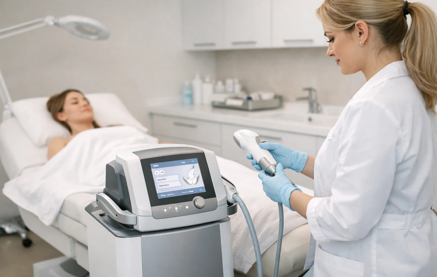 Real-Time Feedback: The clinician ensures the patient is comfortable and the energy levels are optimal.
