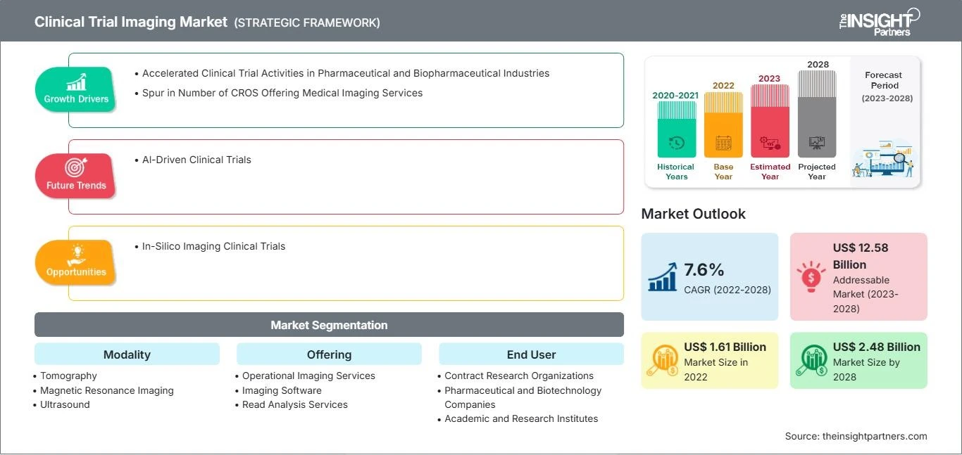 The clinical trial imaging market size is projected to reach US$ 2,480.32 million by 2028 from US$ 1,610.70 million in 2022, registering a CAGR of 7.6% during the forecast period from 2023 to 2028.