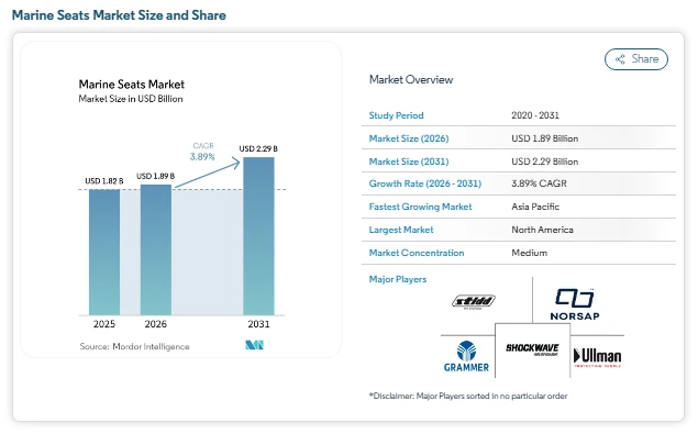 The Marine seats market size in 2026 is estimated at USD 1.89 billion, rising from USD 1.82 billion in 2025 and projected to reach USD 2.29 billion by 2031, growing at a CAGR of 3.89% during the forecast period. This market growth reflects a shift from volume-driven demand to value-focused upgrades across commercial, recreational, and defense vessels. Across the seats industry, buyers are paying closer attention to ergonomics, compliance, and durability rather than simply expanding fleet size. The market continues to show steady progress as the sector balances recovery with long-term stability.