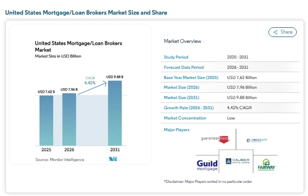 The US mortgage brokers market size is projected to grow from USD 7.62 billion in 2025 to USD 7.96 billion in 2026, eventually reaching USD 9.88 billion by 2031, supported by a CAGR of 4.42% during the forecast period. This market growth reflects how brokers remain relevant even as compliance requirements increase and digital tools become more common across the lending process. The market continues to show steady progress as it adapts to changing borrower needs and lending practices.
