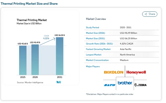 The thermal printing market size is valued at USD 45.49 billion in 2026 and is projected to reach USD 56.20 billion by 2031, growing at a CAGR of 4.32% during the forecast period. This steady expansion highlights consistent demand across retail, logistics, healthcare, and manufacturing environments where fast, reliable, and cost-efficient printing solutions are required.