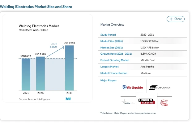 The welding electrodes market size is projected to grow from USD 5.67 billion in 2025 to USD 5.99 billion in 2026, and further reach USD 7.98 billion by 2031, registering a CAGR of 5.89%. This market forecast reflects consistent demand supported by both traditional fabrication work and specialized industrial applications. The market is showing steady progress as demand continues across construction, energy, and heavy engineering sectors.