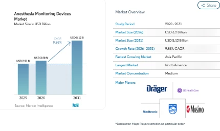 The anesthesia monitoring devices market is witnessing steady expansion driven by rising surgical procedures, increased demand for patient safety during operations, and growing adoption of advanced monitoring technologies in operating rooms. According to recent analysis, the market size was valued at USD 2.91 billion in 2025 and is projected to reach USD 3.2 billion in 2026, further expanding to USD 5.12 billion by 2031 at a CAGR of 9.86% during the forecast period.
