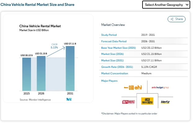 The China vehicle rental market size was valued at USD 20.12 billion in 2025 and is projected to grow from USD 21.15 billion in 2026 to reach USD 27.11 billion by 2031, registering a CAGR of 5.13% during the forecast period. The market is witnessing steady expansion, supported by rising domestic travel, digital booking adoption, and a shift in mobility preferences. The industry continues to benefit from the recovery in tourism, particularly leisure travel, which contributes most to overall demand.
