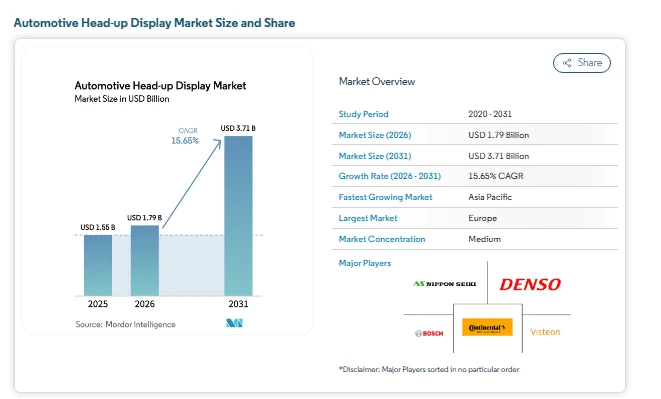 The automotive head up display market size was valued at USD 1.55 billion in 2025 and is estimated to grow to USD 1.79 billion in 2026, reaching USD 3.71 billion by 2031, registering a CAGR of 15.65% during the forecast period (2026–2031). This growth reflects the rising integration of advanced driver assistance systems and the shift toward connected and digital cockpits. The automotive head up display industry is evolving as manufacturers treat HUDs as a core interface rather than an optional feature.