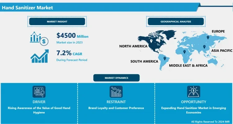 Hand Sanitizer Market Size Was Valued at USD 4500 million in 2023, and is Projected to Reach USD 8413.28 million by 2032, Growing at a CAGR of 7.2% From 2024-2032.