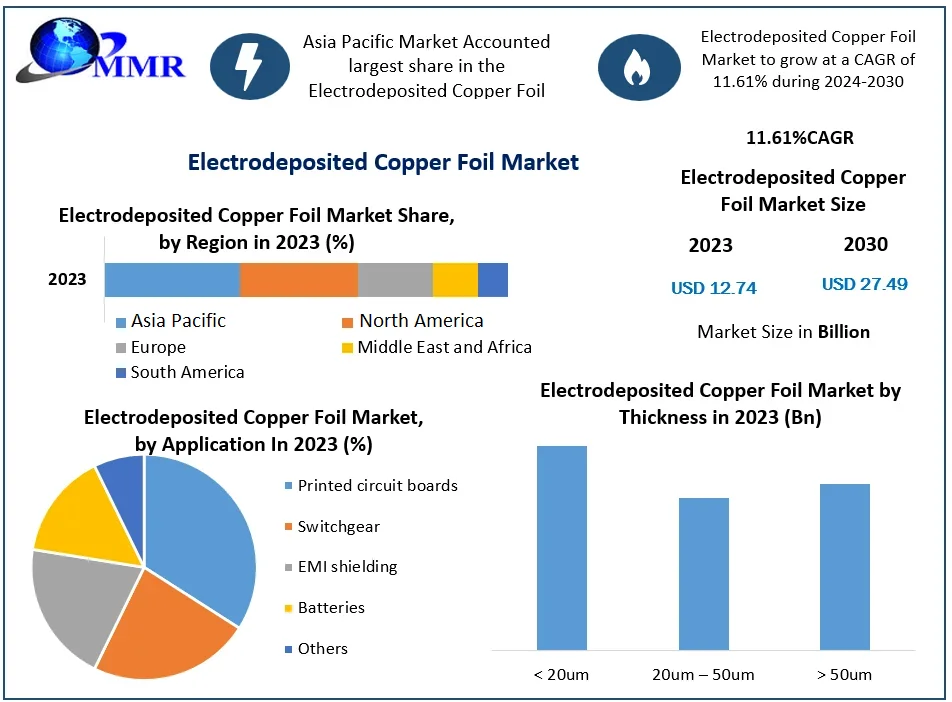 The Global Electrodeposited Copper Foil Market is on a trajectory of substantial expansion, driven by escalating demand from the electronics and electric vehicle (EV) sectors. Valued at approximately US$ 12.74 billion in 2023, the market is projected to reach around US$ 27.49 billion by 2030, exhibiting a Compound Annual Growth Rate (CAGR) of 11.61% during the forecast period.