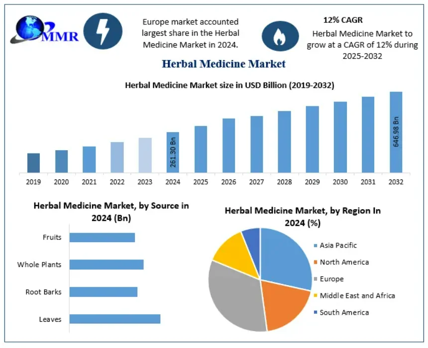The global Herbal Medicine Market is experiencing remarkable growth, driven by increasing consumer preference for natural remedies and rising health consciousness. According to recent reports, the market. The Herbal Medicine Market size was valued at USD 261.30 Billion in 2024 and the total Herbal Medicine revenue is expected to grow at a CAGR of 12% from 2025 to 2032, reaching nearly USD 646.98 Billion.