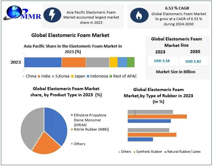 Elastomeric foam, a synthetic rubber insulation material, boasts exceptional durability, moisture resistance, and flexibility, shielding against UV radiation and chemicals. These insulation materials are also known as closedcell elastomeric foam insulation, and flexible elastomeric foam (FEF) insulation, rubber insulation. These foams are commonly used in a wide range of applications, such as HVAC (heating, ventilation, and air conditioning), automotive, construction, and insulation. It has applications in the automotive industry addresses safety, performance, and environmental concerns. Elastomeric foam's multifaceted benefits make it indispensable in various sectors, promising sustained growth and innovation.