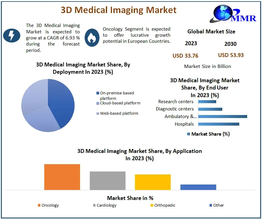 The size of the 3D medical imaging market was estimated at USD 33.76 billion in 2023, and it is anticipated that total revenue from this market will increase at a compound annual growth rate (CAGR) of 6.92 percent between 2024 and 2030, reaching around USD 53.93 billion.