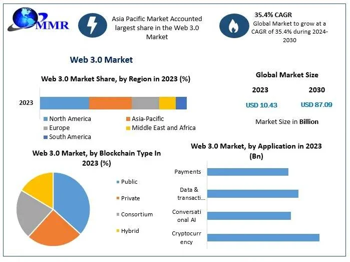 The global Web 3.0 market is on the brink of a transformative expansion, driven by advancements in decentralized technologies and the increasing demand for enhanced user experiences. According to a recent report by Maximize Market Research, the market, valued at USD 10.43 billion in 2023, is anticipated to grow at a compound annual growth rate (CAGR) of 35.4%, reaching nearly USD 87.09 billion by 2030.