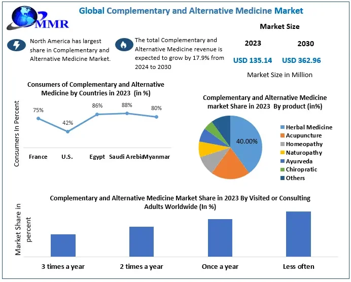 International Alternative and Complementary Medicine The market was estimated to be worth USD 135.14 billion in 2023, and revenue is projected to increase by 17.9% between 2024 and 2030, reaching over USD 362.96 billion.