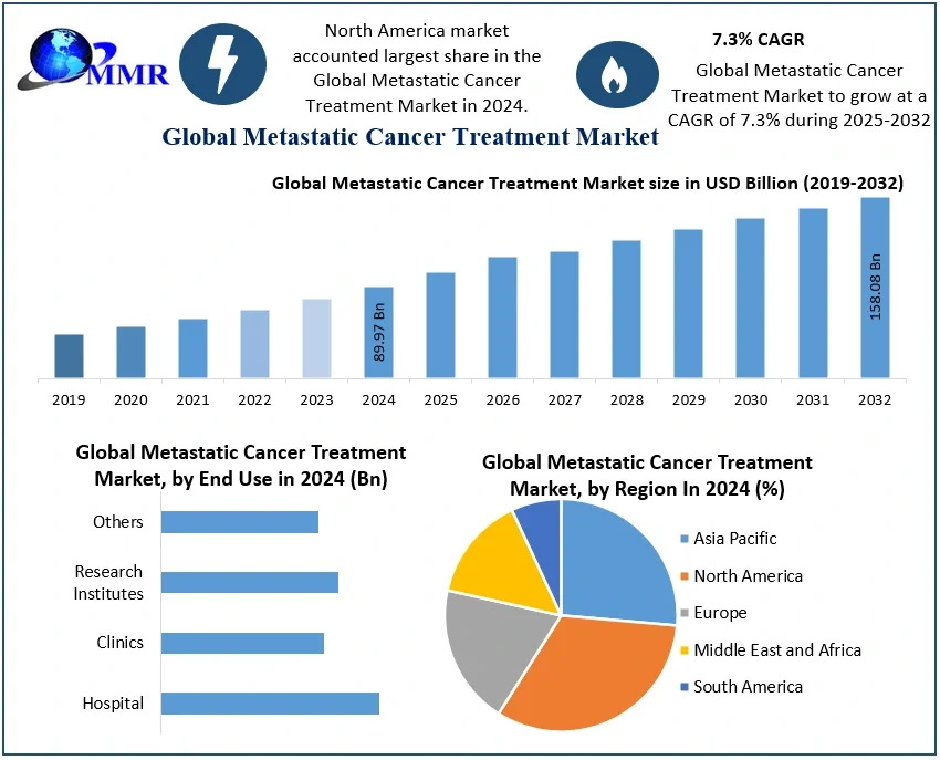 The market for metastatic cancer treatment was estimated to be worth USD 89.97 billion in 2024, and it is anticipated that the total revenue from this treatment will increase at a compound annual growth rate (CAGR) of 7.3% between 2025 and 2032, to reach over USD 158.08 billion.