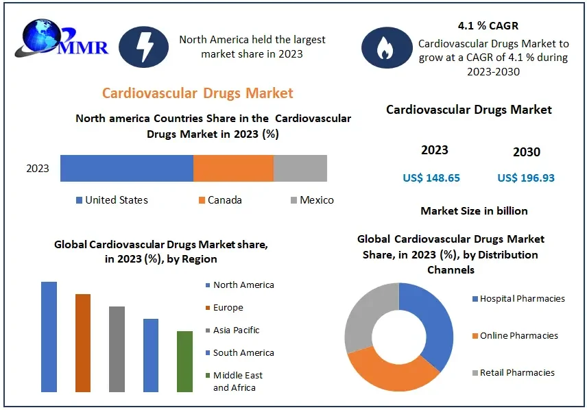 The market for cardiovascular drugs was estimated to be worth US 148.65 billion in 2023, and its revenue is expected to expand at a compound annual growth rate (CAGR) of 4.1% between 2023 and 2030, to reach over USD 196.93 billion.