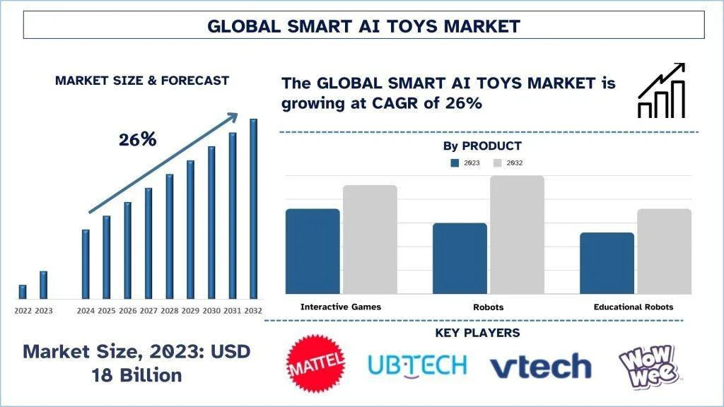 According to the UnivDatos analysis, the growth in AI, machine learning, and IoT technologies enables more sophisticated and interactive toy functionalities, growing disposable income, and emphasis on toys that promote learning in science, technology, engineering, and mathematics (STEM) will drive the global scenario of the Smart AI Toys market. As per their “Smart AI Toys Market” report, the global market was valued at USD 18 Billion in 2023, growing at a CAGR of about 26% during the forecast period from 2024 - 2032 to reach USD billion by 2032.