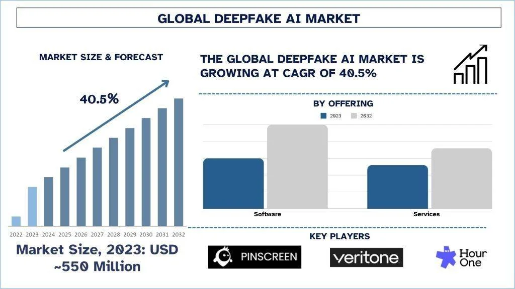 According to the UnivDatos, growing demand for customized videos for marketing, advances in AI and machine learning, rising applications in gaming and AR/VR, and cost-effective content creation drive the Deepfake AI market. As per their “Deepfake AI Market” report, the global market was valued at USD 550 Million in 2023, growing at a CAGR of about 40.5% during the forecast period from 2024 - 2032 to reach USD Million by 2032.