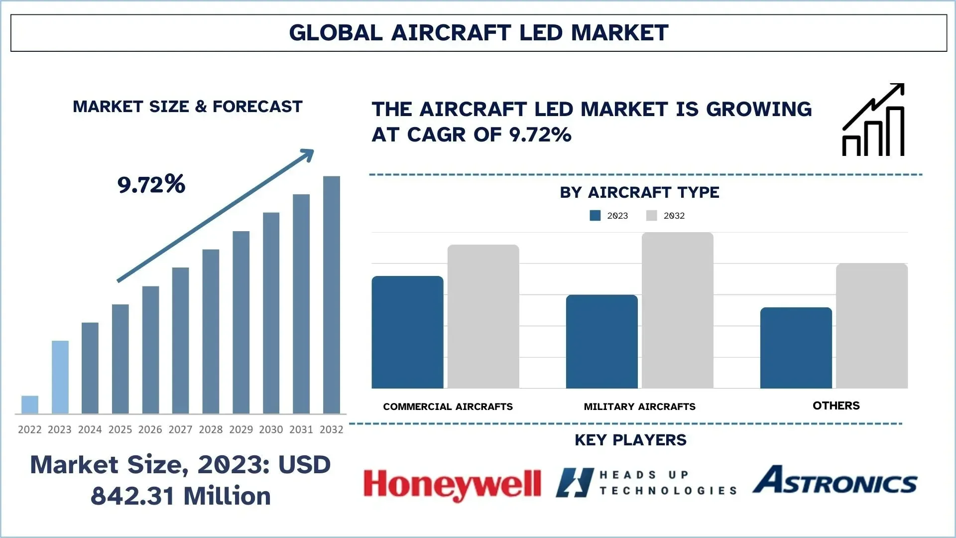 According to the UnivDatos, growing demand for fuel-efficient and lightweight aircraft, along with the need for enhanced cabin aesthetics are driving the growth of the aircraft LED market worldwide. As per their “Aircraft LED Market” report, the global market was valued at USD 842.31 million in 2023, growing at a CAGR of about 9.72% during the forecast period from 2024 - 2032 to reach USD million by 2032.