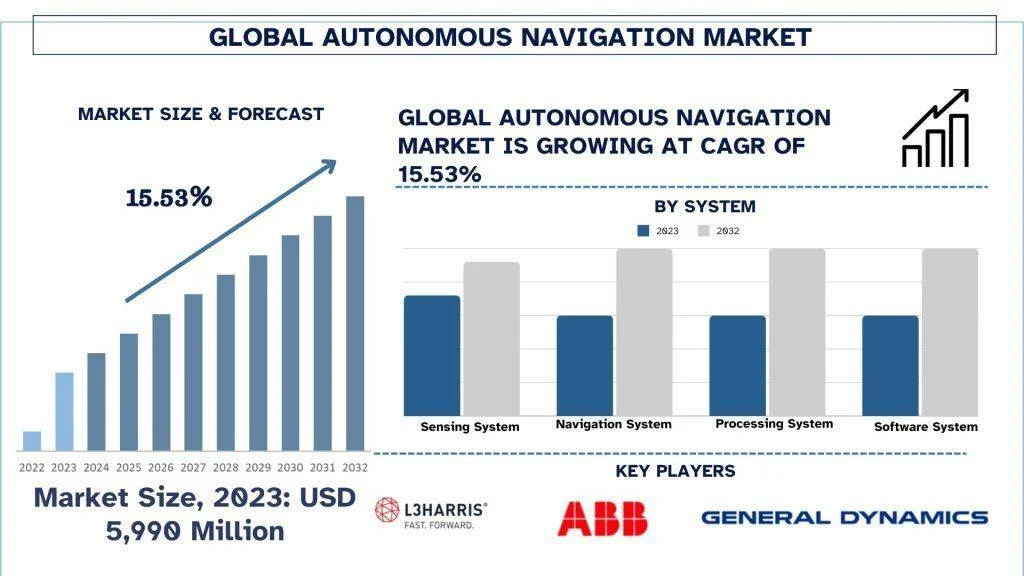 According to the UnivDatos, growing investments in Autonomous Navigation for improving passenger experience, the sector will surge in demand for the Global Autonomous Navigation market, which will drive the global scenario of the “Global Autonomous Navigation Market” report; the global market was valued at USD 5990 million in 2023, growing at a CAGR of 15.56% during the forecast period from 2024 - 2032 to reach USD million by 2032.
