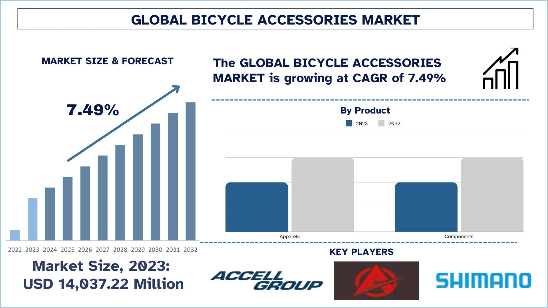 According to the UnivDatos, as per their “Bicycle Accessories Market” report, the global market was valued at USD 14,037.22 million in 2023, growing at a CAGR of about 7.49% during the forecast period from 2024-2032 to reach USD million by 2032.