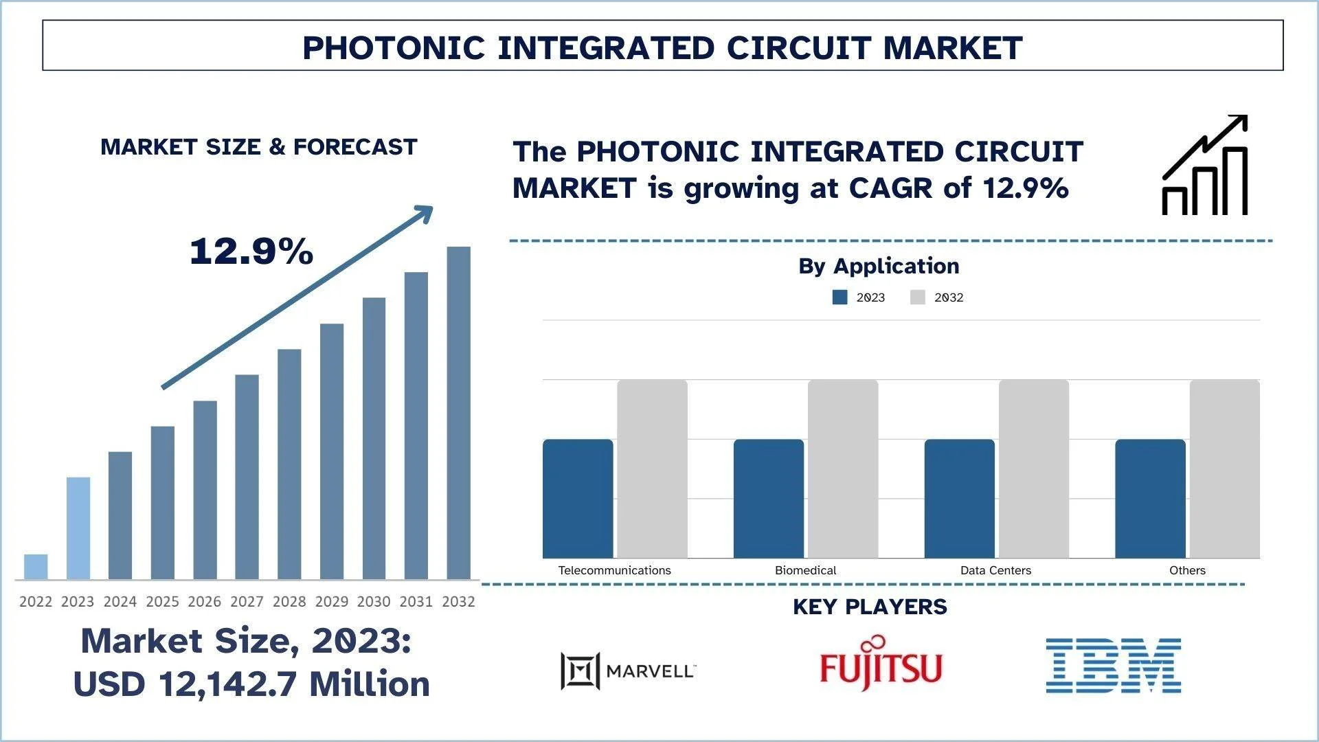 According to the UnivDatos, the rising demand for high-speed, energy-efficient data transmission solutions to support expanding digital infrastructure and data-intensive applications would drive the global scenario of the Photonic Integrated Circuit market. As per their “Photonic Integrated Circuit Market” report, the global market was valued at USD 12,142.7 Million in 2023, growing at a CAGR of 12.9% during the forecast period from 2024 - 2032 to reach USD Million by 2032.