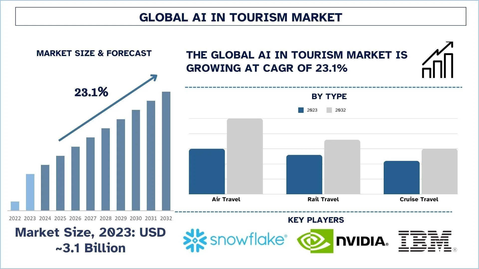 According to a new report by UnivDatos, AI in the Tourism market is expected to reach USD Billion in 2032 by growing at a CAGR of 23.1%. Artificial intelligence technologies deployed in tourism services prioritize experience optimization while optimizing operational resources to generate better decision outcomes throughout the tourism sector. Travel and tourism businesses use AI-powered applications including customer service chatbots alongside machine learning recommendation engines, customer demand forecasting programs, and facial recognition hardware. Travel companies along with hotels airlines and tourism boards can maximize their efficiency alongside increasing customer engagement and retail pricing optimization through automated big data processing with natural language capabilities.