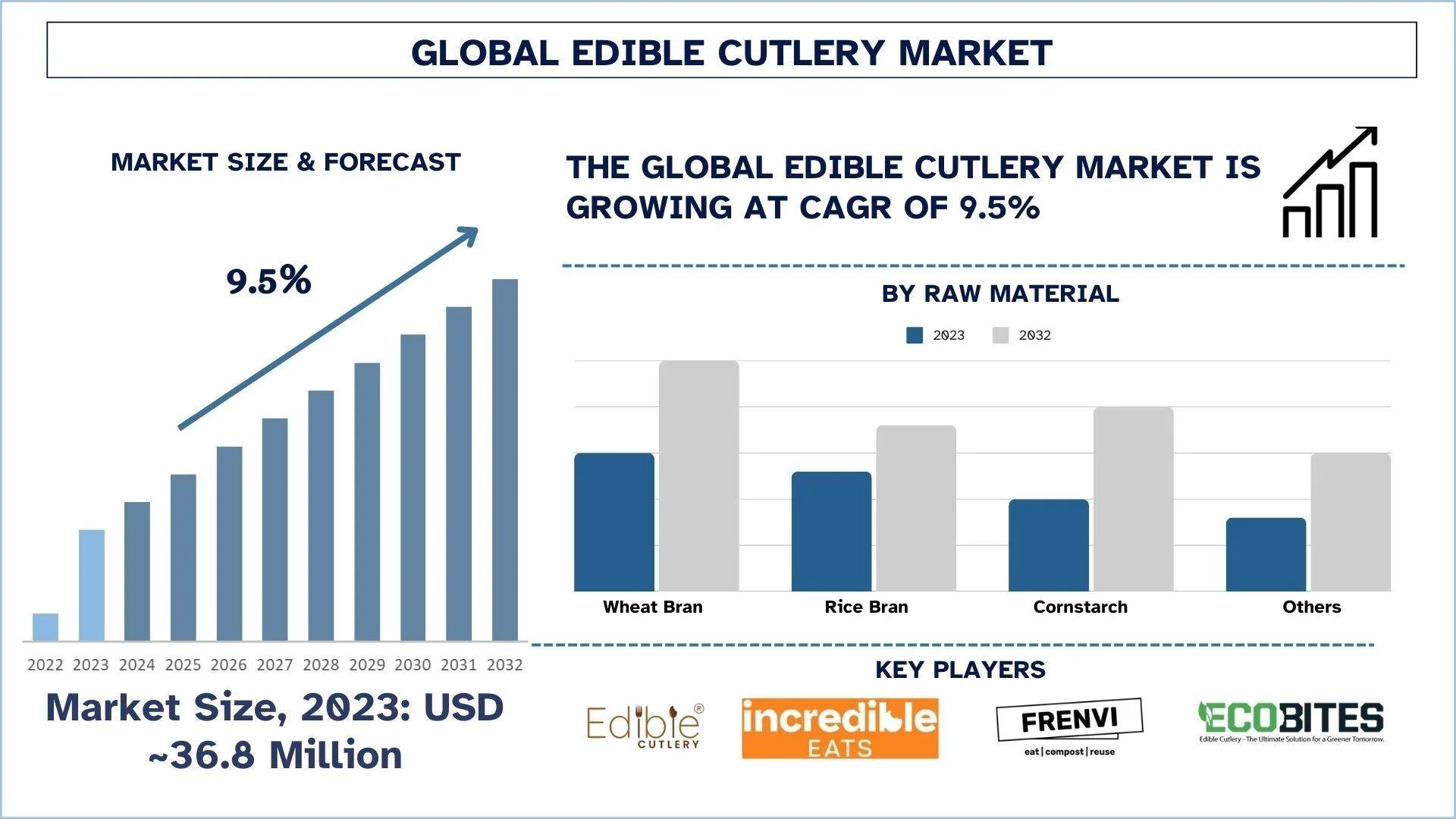Edible cutlery is useful and a step towards reaching a sustainable future because it helps to solve the problem of plastics. Due to awareness of environmental issues and favorable legislation, its constantly increasing demand strengthens the belief that this new product can dramatically change the food services, catering, and dining sectors one day. Nonetheless, concerns about cost and manufacturing difficulties are yet to cease, use of edible cutlery is gradually advancing and developing new possibilities. Through the use of such utensils individuals and organizations hope to make their world a little less dirty and help save the planet one bite at a time. According to the UnivDatos, growing consumer demand for sustainable and eco-friendly products, increasing concerns about plastic pollution and environmental impact, innovations in edible materials offering better strength and flavor, and expansion of the foodservice industry seeking eco-friendly alternatives drive the Edible Cutlery market. As per their “Edible Cutlery Market” report, the global market was valued at USD 36.8 Million in 2023, growing at a CAGR of about 9.5% during the forecast period from 2024 - 2032.