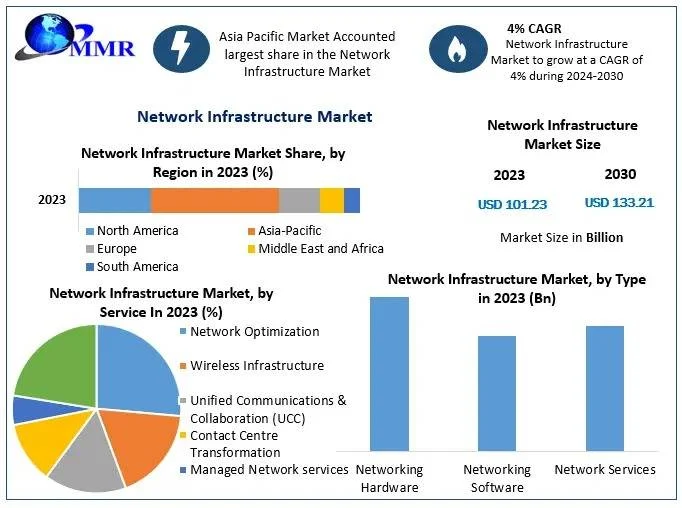 The Global Network Infrastructure Market was valued at USD 101.23 billion in 2023 and is projected to reach USD 133.21 billion by 2030, expanding at a CAGR of 4% during the forecast period. This growth is driven by the increasing demand for high-speed internet, advancements in wireless technology, and the expanding application of network solutions across various sectors