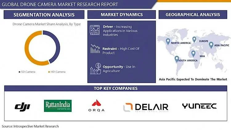 - Drone Camera Executive Summary: It gives a summary of overall studies, growth rate, available market, competitive landscape, market drivers, trends, and issues, and macroscopic indicators.