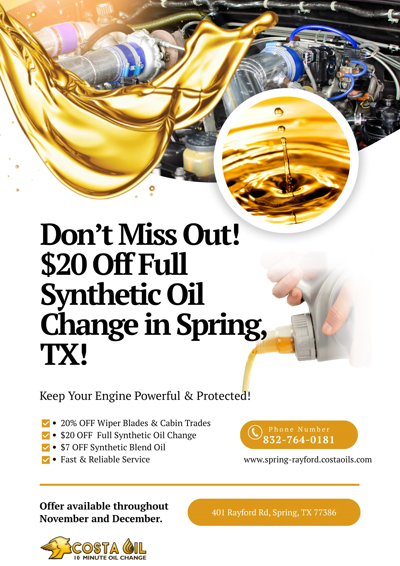 Experience top-quality automotive care with our Premium Oil Change Service in Spring, TX. At Costa Oil – Spring Rayford, we use high-grade oils, advanced filters, and professional service techniques to keep your engine running at its best.https://spring-rayford.costaoils.com/ Experience top-quality automotive care with our Premium Oil Change Service in Spring, TX. At Costa Oil – Spring Rayford, we use high-grade oils, advanced filters, and professional service techniques to keep your engine running at its best.0 Comments 0 Shares - Save Big with $20 Off Full Synthetic Oil Change Today