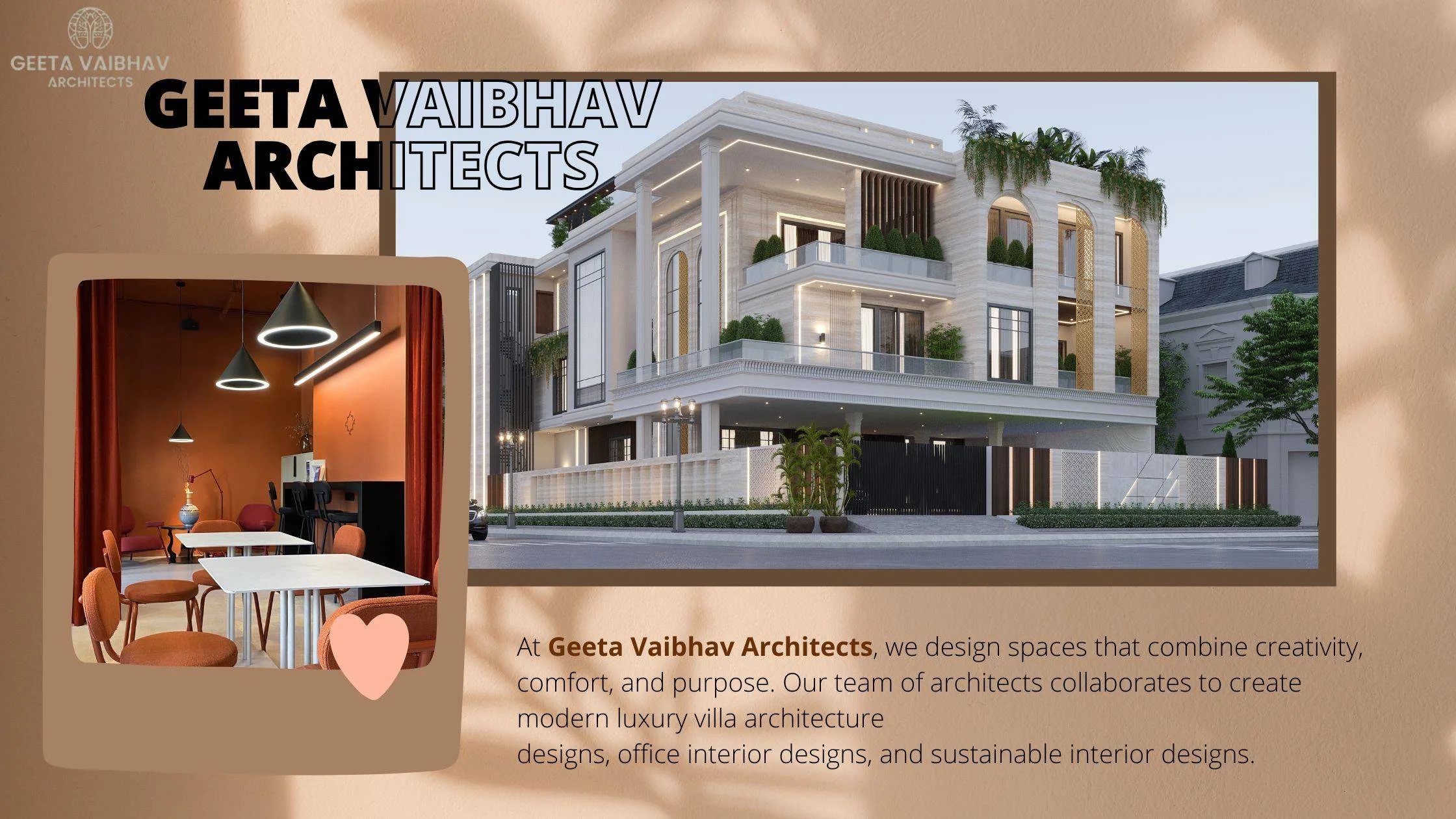 At Geeta Vaibhav Architects, we design spaces that combine creativity, comfort, and purpose. Our team of architects collaborates to create modern luxury villa architecture designs, office interior designs, and sustainable interior designs. We bring precision in planning and deliver modern & luxury interior design that balances beauty with functionality. Our approach is rooted in timeless ideas yet focused on future possibilities, ensuring every project leaves a lasting impact. With luxury architecture that beats with nature, we craft spaces that inspire growth and culture.