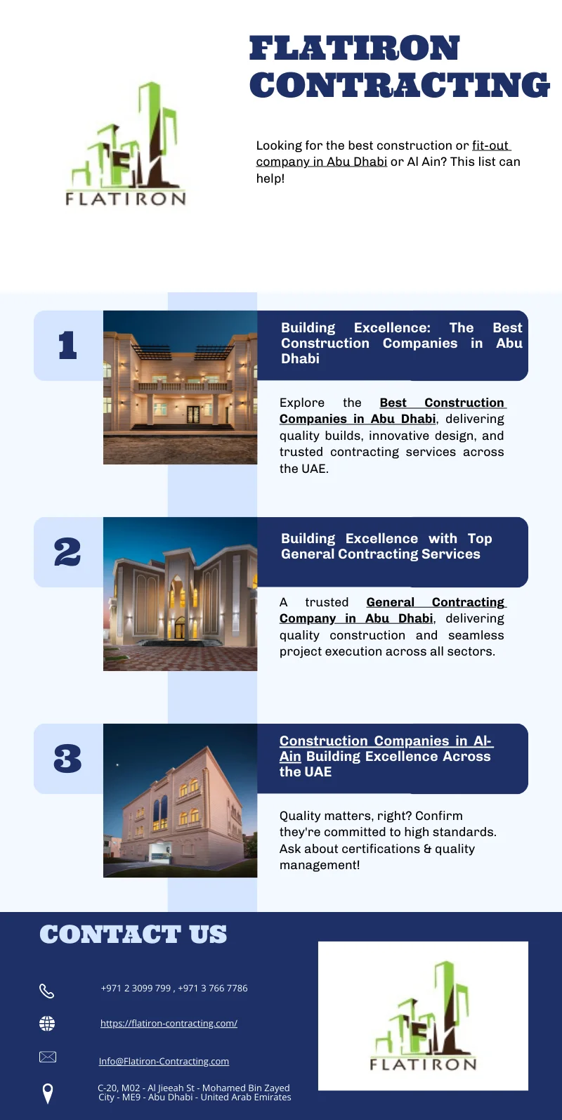 https://focusonpeople.com/courses/executive-coaching/At Focus Training, our executive coaching programmes are designed to unlock potential, enhance leadership skills, and drive measurable performance improvements. Recognised among the best executive coaching firms, we offer personalised, result-driven executive coaching training courses that help professionals lead with confidence, emotional intelligence, and clarity. Whether you are an individual aiming for career growth or an organisation developing future leaders, our courses provide practical tools, one-on-one coaching, and actionable strategies to achieve real-world success. https://focusonpeople.com/courses/executive-coaching/0 Comments 0 Shares - Flatiron Contracting is a leading general contracting company in Abu Dhabi and Building Contracting Company in UAE, specializing in high-quality construction and innovative design solutions. Recognized among the best construction companies in Abu dhabi, we deliver exceptional residential, commercial, and industrial projects tailored to client needs.Our expertise extends to being one of the top construction companies in Al Ain, offering reliable and efficient services. As one of the trusted contracting companies in Al Ain, we ensure projects are completed with precision, quality, and on schedule.As a premier fit out contracting company in Abu Dhabi, we create stunning interior spaces that reflect elegance, functionality, and modern design trends. Additionally, our reputation as leading villa construction companies in Abu Dhabi ensures luxurious, custom-built homes that meet the highest standards of craftsmanship and sophistication.
