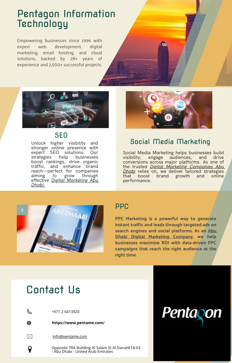 - Pentagon Information Technology, established in 1996, is a global leader in digital solutions, offering services like web development, digital marketing, email hosting, and cloud infrastructure. With over 28 years of experience and a portfolio of 2,500+ projects, they empower businesses worldwide through innovative, client-centric strategies.Choose the Digital Agency In Abu Dhabi , offers free digital marketing cosultation. Are you struggling to achieve the desired outcomes from your digital presence? Pentagon will helps you to expand your global reach. As one of the fastest-growing Digital Marketing Companies Abu Dhabi and all ove UAE, Pentagon provides clients with creative solutions to reach their maximum potential through versatile IT solutions.