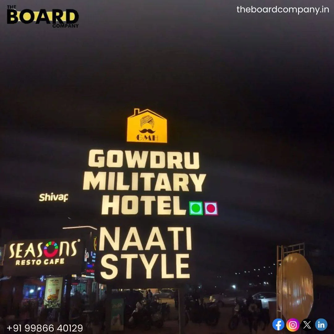 #3DSignBoardManufacturersInBangalore #GowdruMilitaryHotel #SignageDesign #BangaloreBusiness #OutdoorAdvertising #LEDsignage #TheBoardCompany #Bangalore