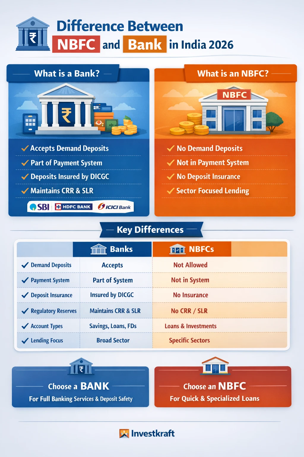 Learn the difference between bank and NBFC and explore the difference between banking and non banking financial institutions. See the nbfc vs bank difference, nbfc and bank difference, and the difference between banks and NBFC in a simple, visual guide.