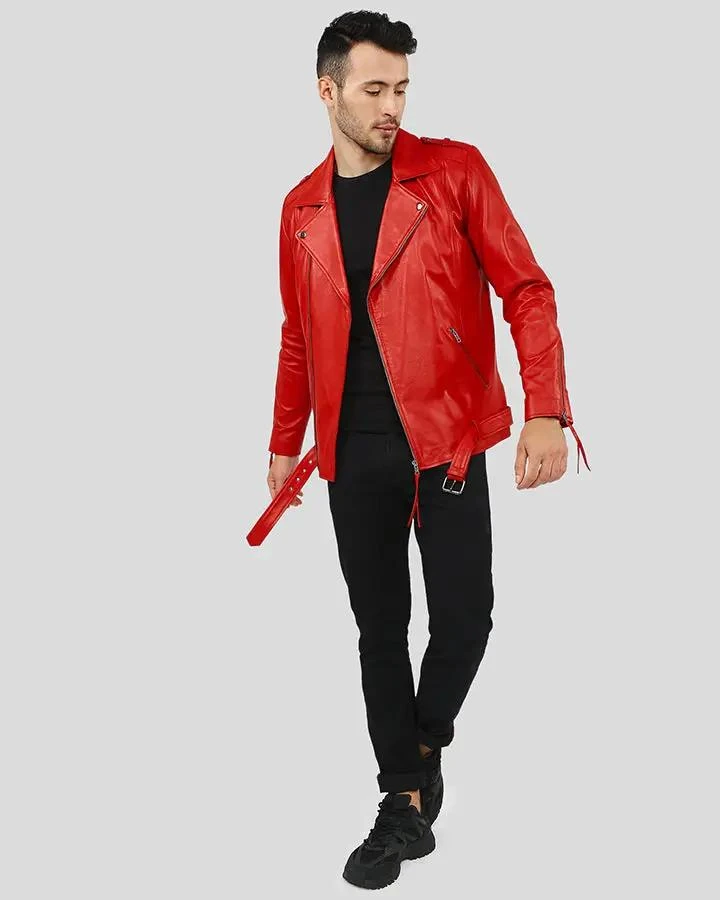 Turn heads with the Buel Red Motorcycle Leather Jacket. Designed by NYC Leather Jackets, this vibrant piece in mens belted leather jackets enhances your ride with bold color and premium detailing.